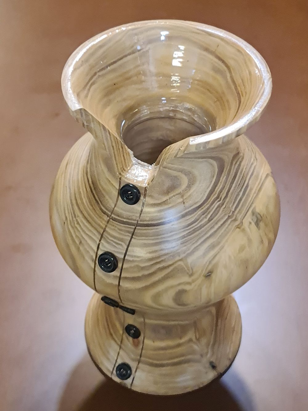 An epoxy-based lamp. A mold from cheap wood (left) was turned